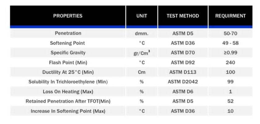 50/70 Bitüm standart bir penetrasyon sınıfı bitümen olup genellikle yol yapımı ve üstün özelliklere sahip asfalt döşeme üretimi için uygun bir kaplama sınıfı olarak kullanılır. Bu bitüm esas olarak sıcak karışımlı asfalt üretiminde kullanılır.